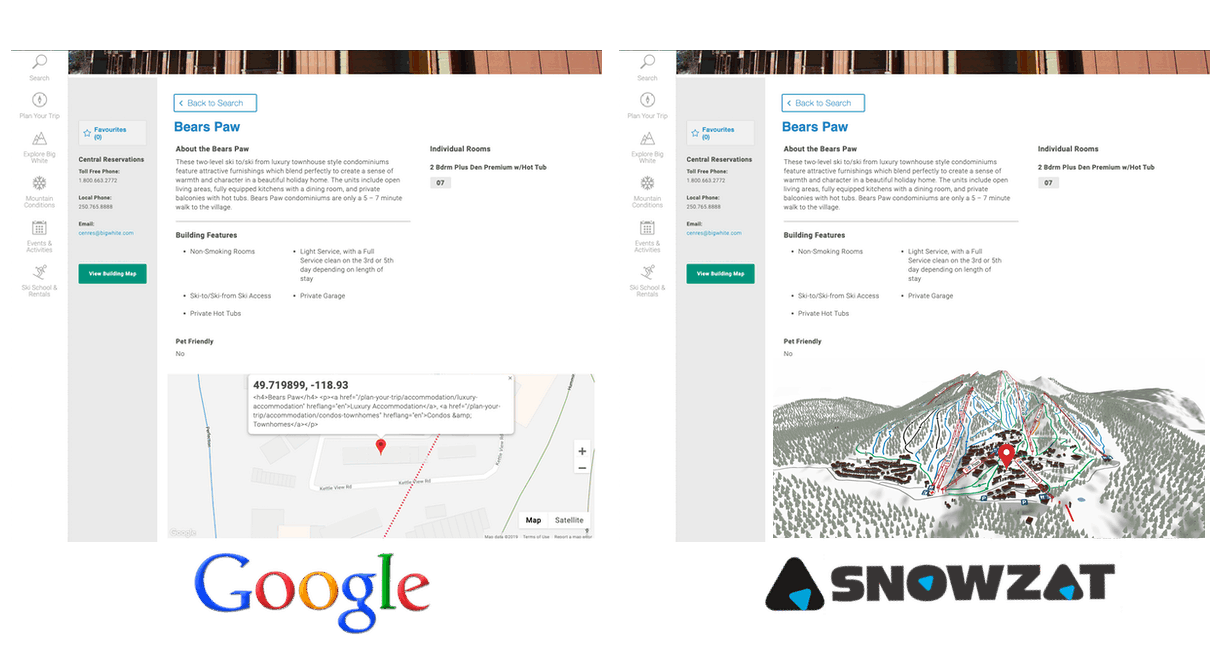 Replace an existing Google map with a SnowZat map for accommodation listings. See the example below. The SnowZat map allows the potential customer to truly understand the location of the accommodation within the resort.